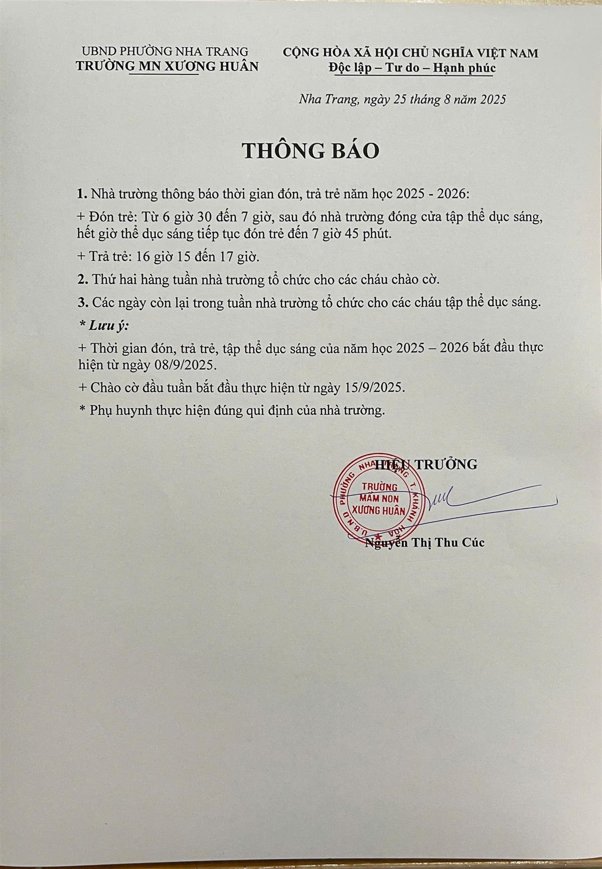 THÔNG BÁO THỜI GIAN ĐÓN TRẢ TRẺ VÀ MỘT SỐ HOẠT ĐỘNG CỦA NHÀ TRƯỜNG TRONG TUẦN